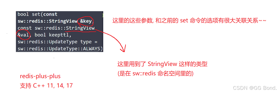 这里set中第一个参数的类型为 sw::redis::stringView ,我们可以把这个类型理解为只可读不可改的string类型