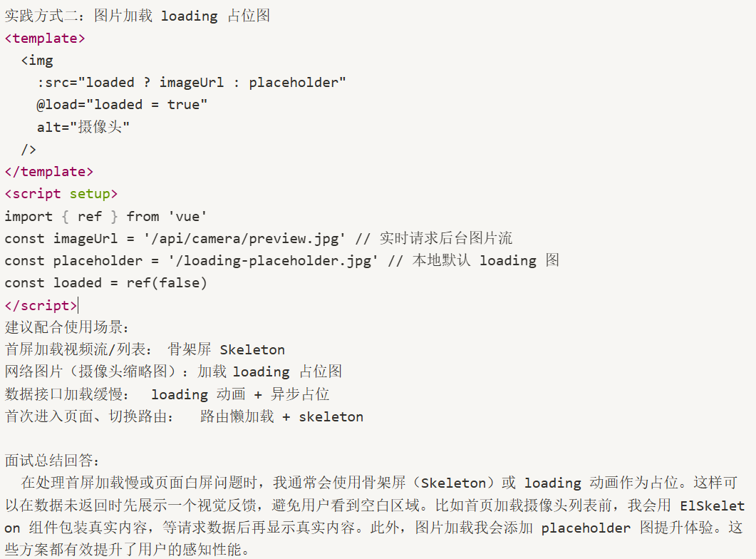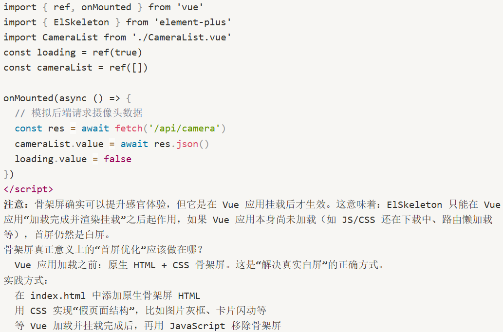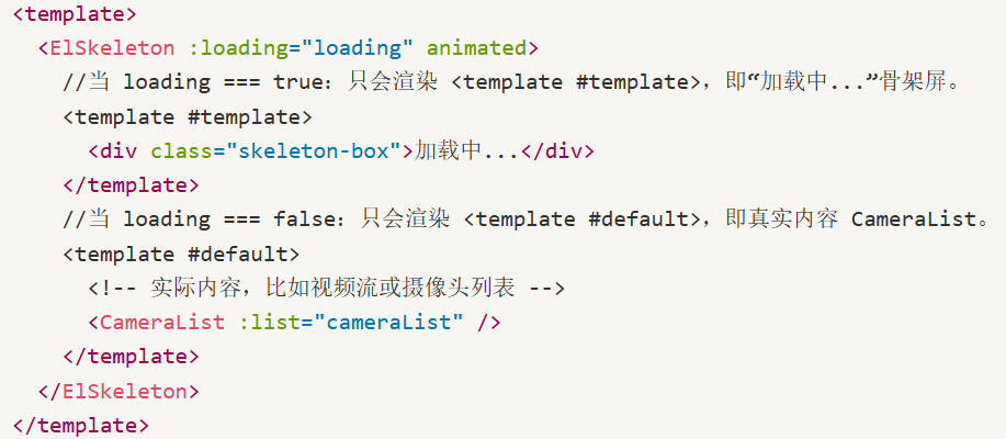 比如首页加载视频流或摄像头列表前,先展示占位:<Skeleton :loading="loading" />