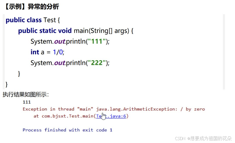 异常(Exception)的概念异常指程序运行过程中出现的非正常现象,例如除数为零、需要处理的文件不存在、数组下标越界等。在Java的异常处理机制中,引进了很多用来描述和处理异常的类,称为异常类。异常类定义中包含了该类异常的信息和对异常进行处理的方法。我们开始看我们的第一个异常对象,并分析一下异常机制是如何工作的。
