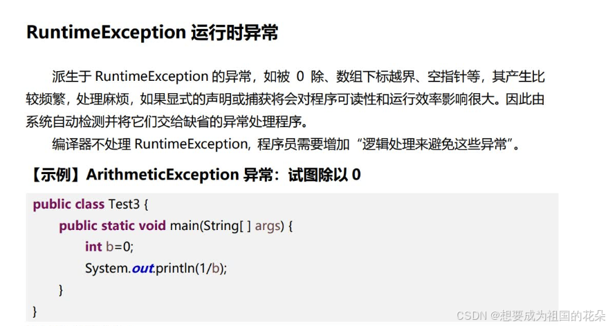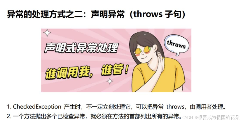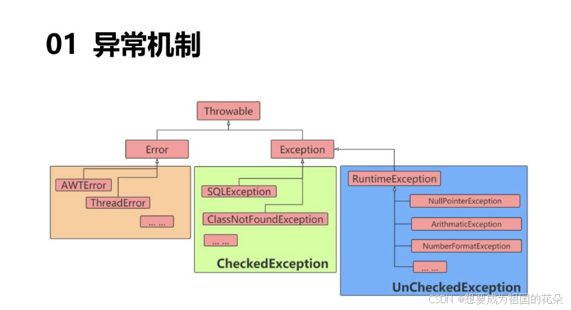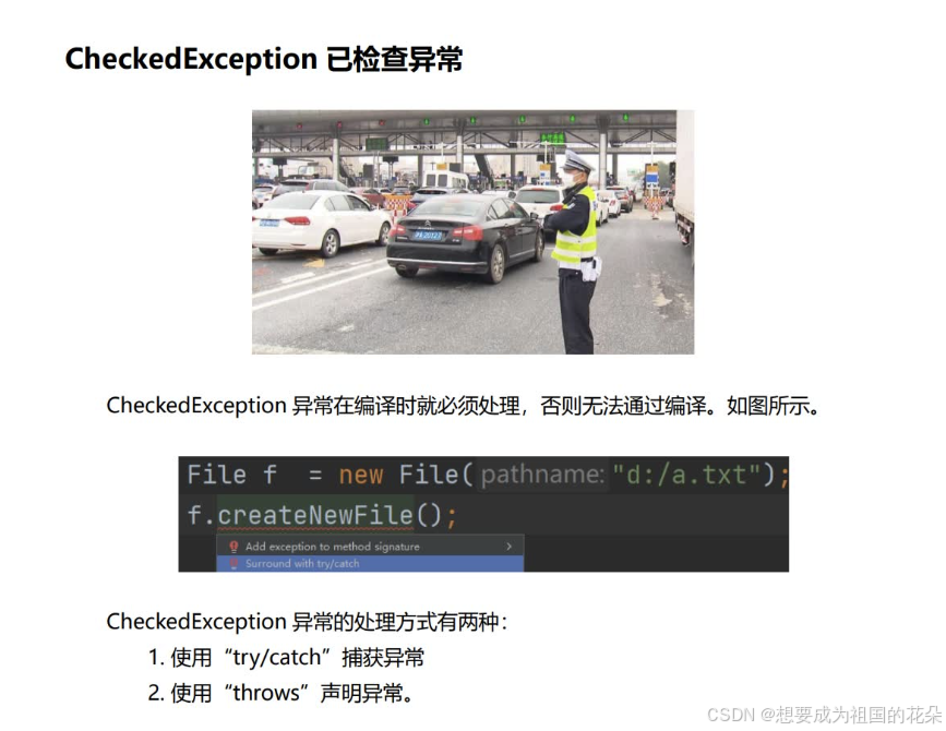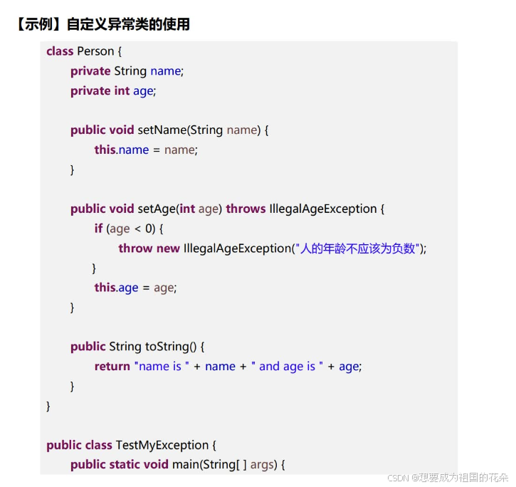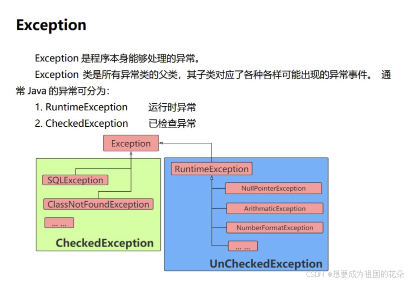 自定义异常在程序中,可能会遇到JDK提供的任何标准异常类都无法充分描述清楚我们想要表达的问题,这种情况下可以创建自己的异常类,即自定义异常类。自定义异常类只需从Exception类或者它的子类派生一个子类即可。自定义异常类如果继承Exception类,则为CheckedException异常,必须对其进行处理;如果不想处理,可以让自定义异常类继承运行时异常RuntimeException类。
