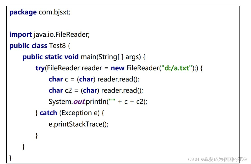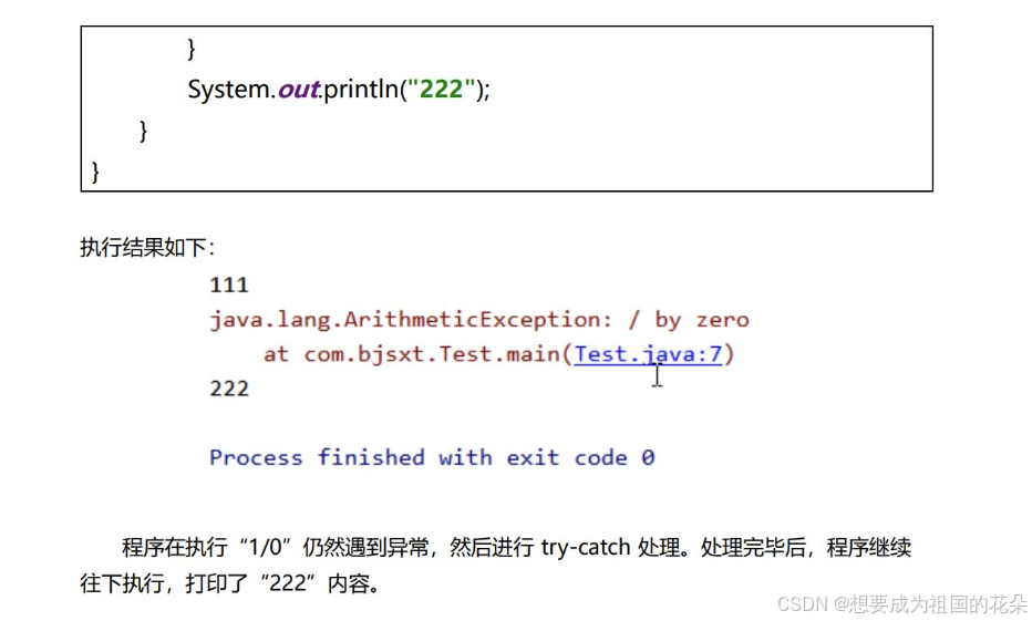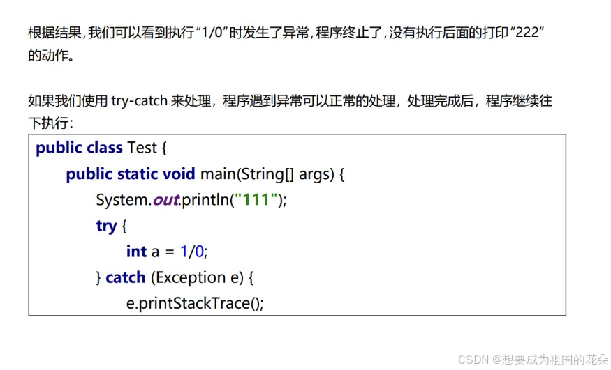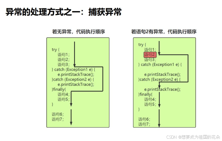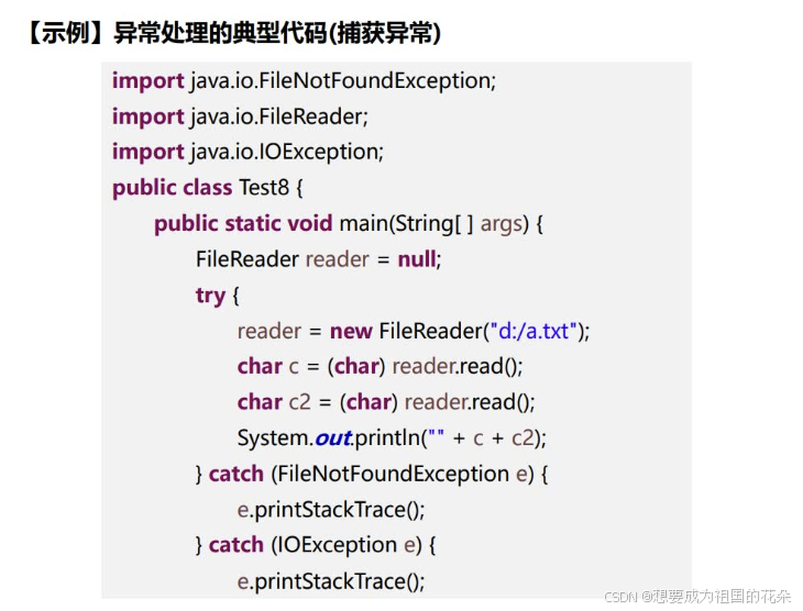 catch:每个try语句块可以伴随一个或多个catch语句,用于处理可能产生的不同类型的异常对象。catch捕获异常时的捕获顺序:如果异常类之间有继承关系,先捕获子类异常再捕获父类异常。finally:不管是否发生了异常,都必须要执行。通常在finally中关闭已打开的资源,比如:关闭文件流、释放数据库连接等。