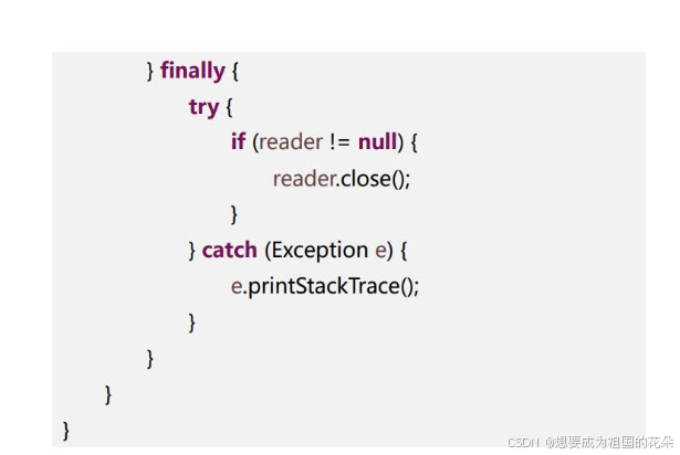 try-with-resource自动关闭AutoClosable接口的资源JAVA中,JVM的垃圾回收机制可以对内部资源实现自动回收,给开发者带来了极大的便利。但是JVM对外部资源(调用了底层操作系统的资源)的引用却无法自动回收,例如数据库连接,网络连接以及输入输出IO流等。这些连接就需要我们手动去关闭,不然会导致外部资源泄露,连接池溢出以及文件被异常占用等。JDK7之后,新增了“try-with-resource”。它可以自动关闭实现了AutoClosable接口的类,实现类需要实现close()方法。”try-with-resources声明”,将try-catch-finally 简化为try-catch,这其实是一种语法糖,在编译时仍然会进行转化为try-catch-finally 语句。