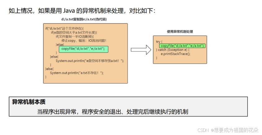 导引问题工作中,程序遇到的情况不可能完美。比如:程序要打开某个文件,这个文件可能不存在或者文件格式不对;程序在运行着,但是内存或硬盘可能满了等等。软件程序在运行过程中,非常可能遇到刚刚提到的这些问题,我们称之为异常,英文是:Exception,意思是例外。遇到这些例外情况,或者叫异常,我们怎么让写的程序做出合理的处理,安全的退出,而不至于程序崩溃呢?我们本章就要讲解这些问题。如果我们要拷贝一个文件,在没有异常机制的情况下,我们需要考虑各种异常情况,伪代码如下: