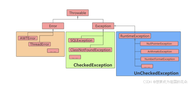 异常分类Java中定义了很多异常类,这些类对应了各种各样可能出现的异常事件,所有异常对象都是派生于Throwable类的一个实例。如果内置的异常类不能够满足需要,还可以创建自己的异常类。Java对异常进行了分类,不同类型的异常分别用不同的Java类表示,所有异常的根类为java.lang.Throwable,Throwable下面又派生了两个子类:Error和Exception。Java异常类的层次结构如图所示: