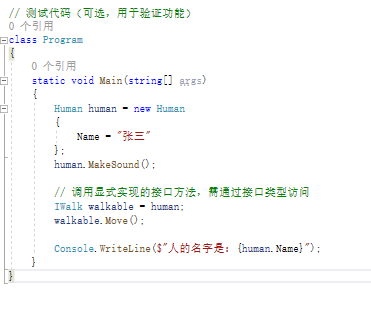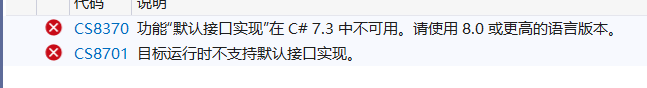 从C# 8.0开始,接口可以包含默认实现,允许在不破坏现有代码的情况下扩展接口(图示为在7.3版本下调用默认接口的情况):
