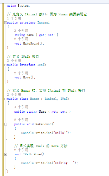 当多个接口具有相同的方法签名时,可以使用显式实现避免冲突。显式实现通过接口名限定方法名: