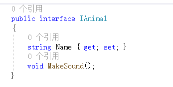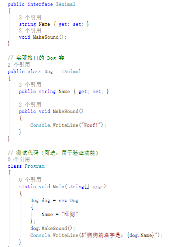 接口的定义通常包括方法、属性或事件的签名,但不包含实现细节。以下是一个简单的接口示例: