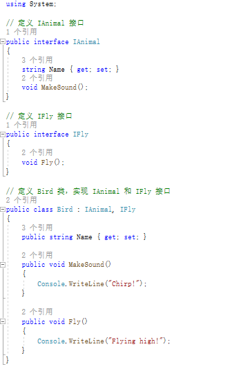 C#允许一个类实现多个接口,解决了单继承的限制。例如: