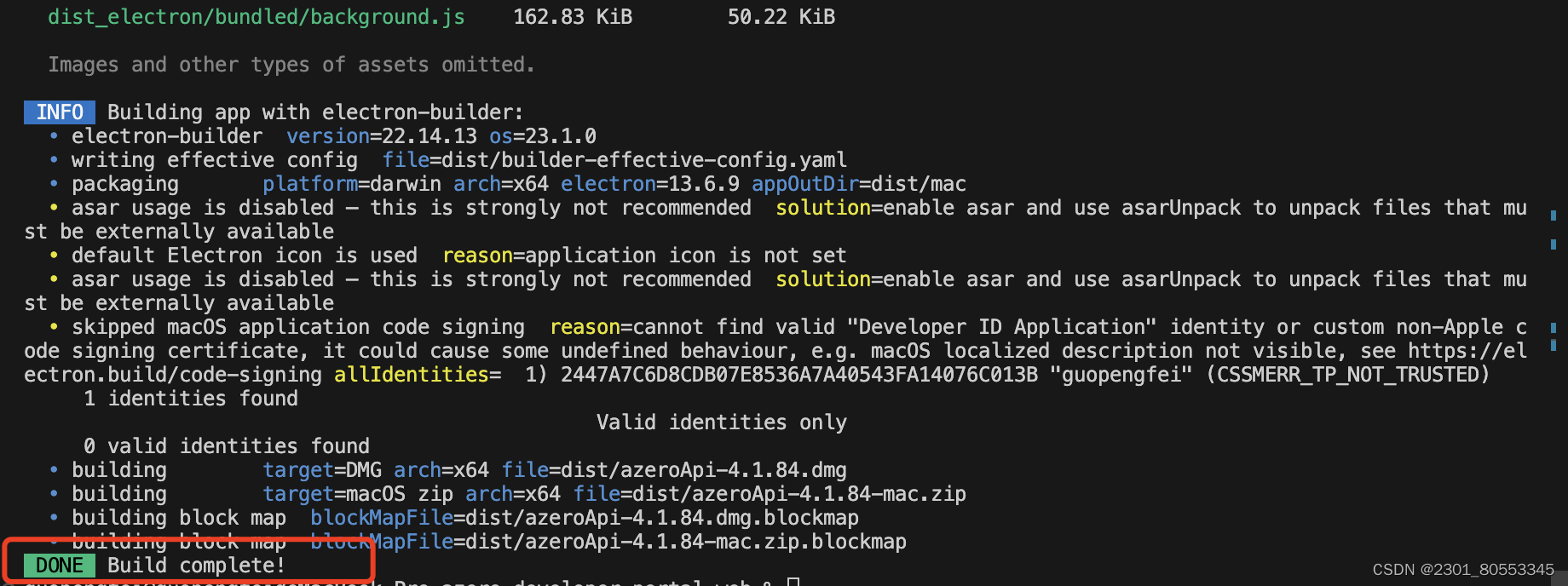 npm run electron:build打包,打包成功如下,会在dist文件夹中生成包
