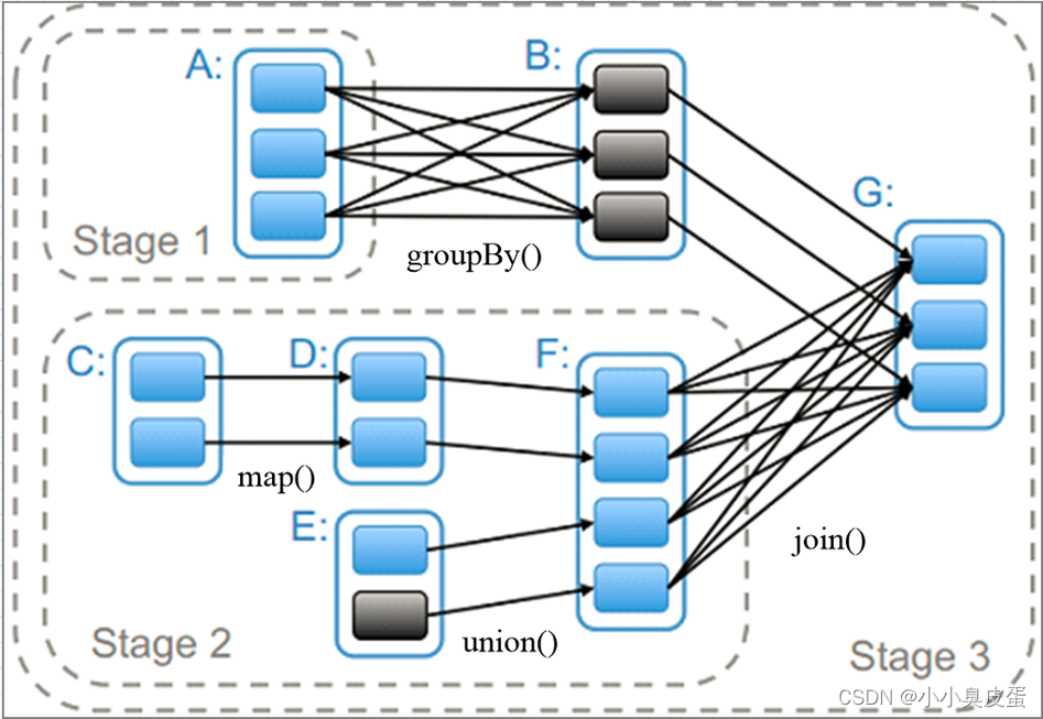 spark遇到宽依赖则划分一个Stage,遇到窄依赖则将这个RDD的操作加入到该stage,Shuffle操作定义于stage边界。