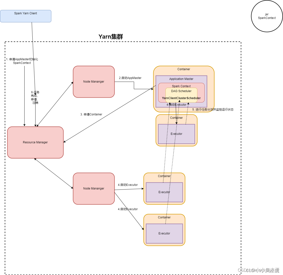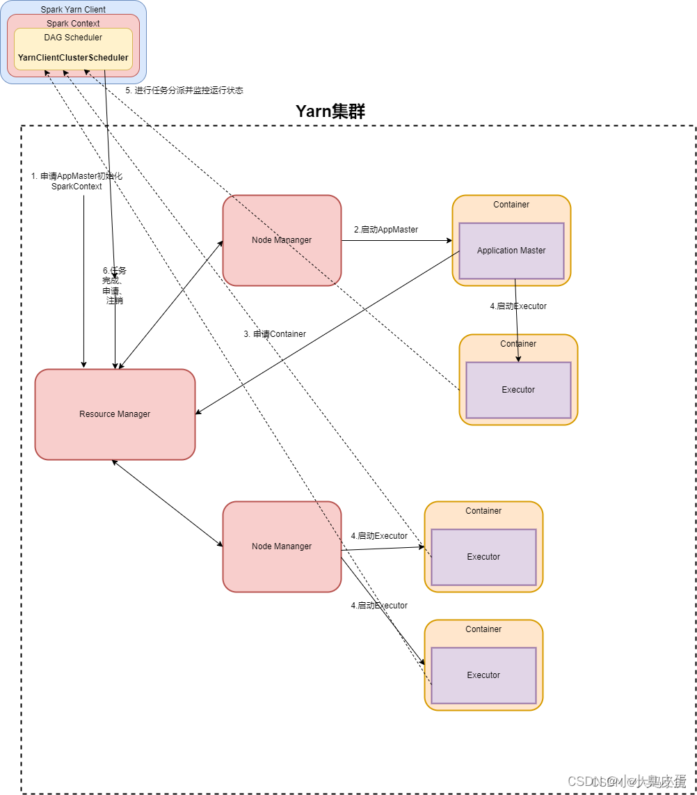 2.yarn框架的年级主任指定某个班主任启动container,并且将实习生小美分配给了某个班主任