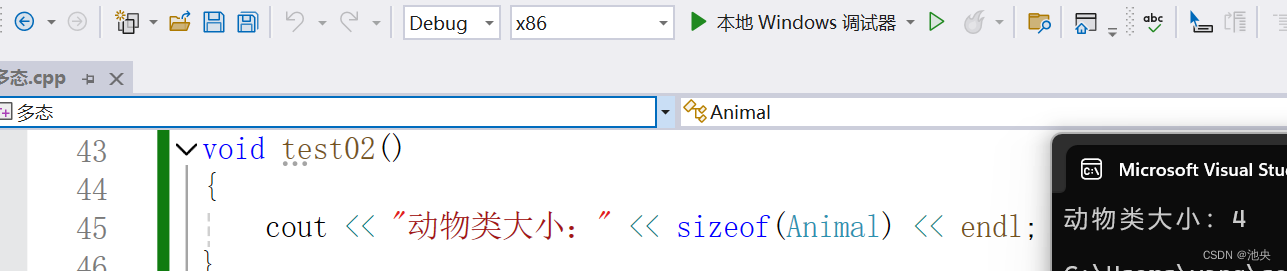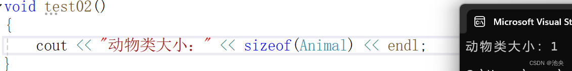 如下图,动物类里面没有任何的数据成员,只有一个speak()函数那他的大小是多少呢?