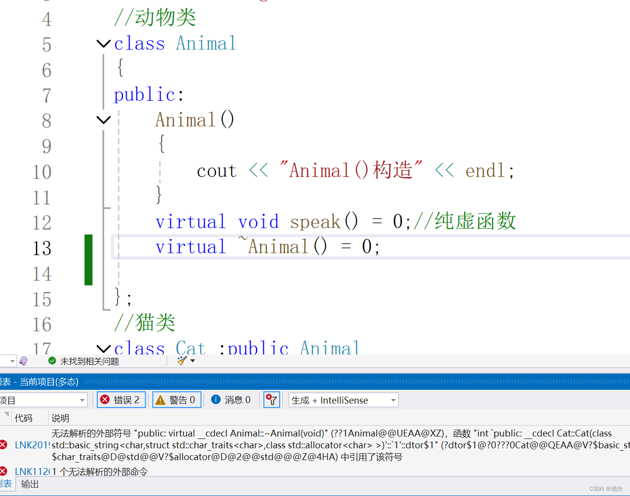 为什么会出现这种情况,有无法解析的外部命令呢?这说明在连接时出现了问题,因为在我们纯虚析构写完的时候他其实只是一个声明,并没有函数的具体实现。