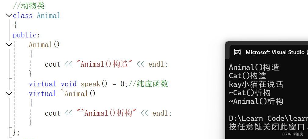 纯虚函数语法:virtual 返回类型 函数名(参数列表)= 0;