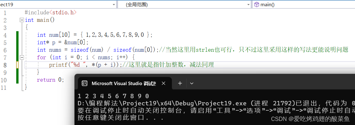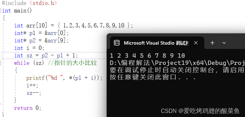 在基本了解指针相减的含义后,我们来尝试一下指针相减的基本应用,来检验一下自己掌握得怎么样。上文我们利用指针进行了输出整个数组,接下来我们换一个处理方式来输出: