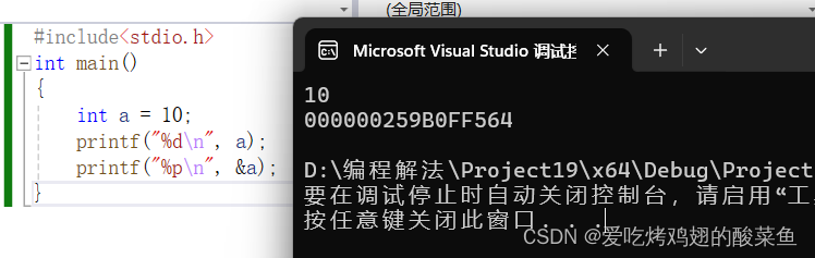 我们上下依次将a的值和地址都打印了出来。 &a将地址取出来后打印,数据类型%p为地址数据。