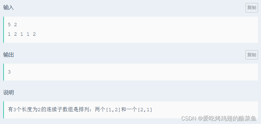 从以上的模拟我们应该能发现规律,每次往后地推一位只是少了第一个数多了最后一个数,在判断该子序列是否满足题意时也大可不必采用for循环大法,可以通过判断每位数出现的次数,如果出现的次数num刚好等于k,那么ans++;相反如果子序列中有重复的数,num<k,那么ans不做处理,最后输出即可。