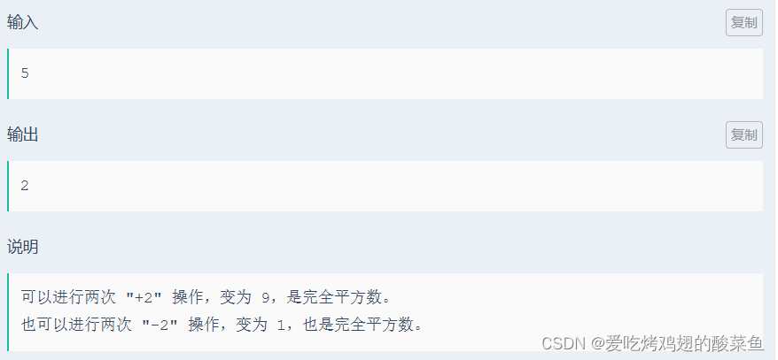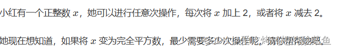 在知晓这一个性质之后就可以开始敲代码了,先寻找输入的这个数在哪俩个相邻的完全平方数之间,然后寻找该数离哪一个完全平方数的距离是偶数,最后输出即可。