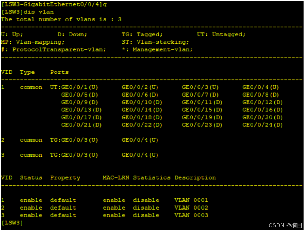 [LSW3-GigabitEthernet0/0/1]undo stp enable