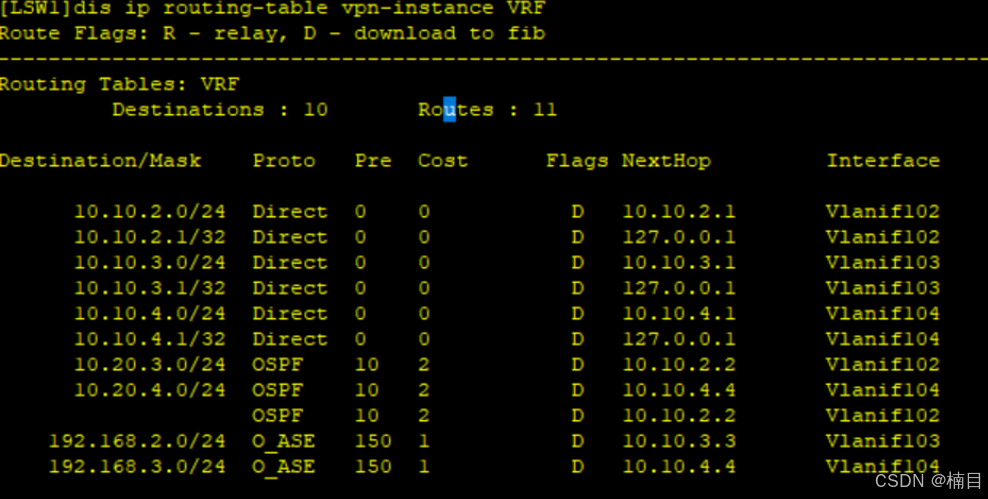 [LSW1-Vlanif102]ip binding vpn-instance VRF(将接口转入VRF中)