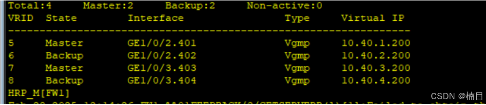 [FW2-GigabitEthernet1/0/2.401]vrrp vrid 5 virtual-ip 10.40.1.200 standby