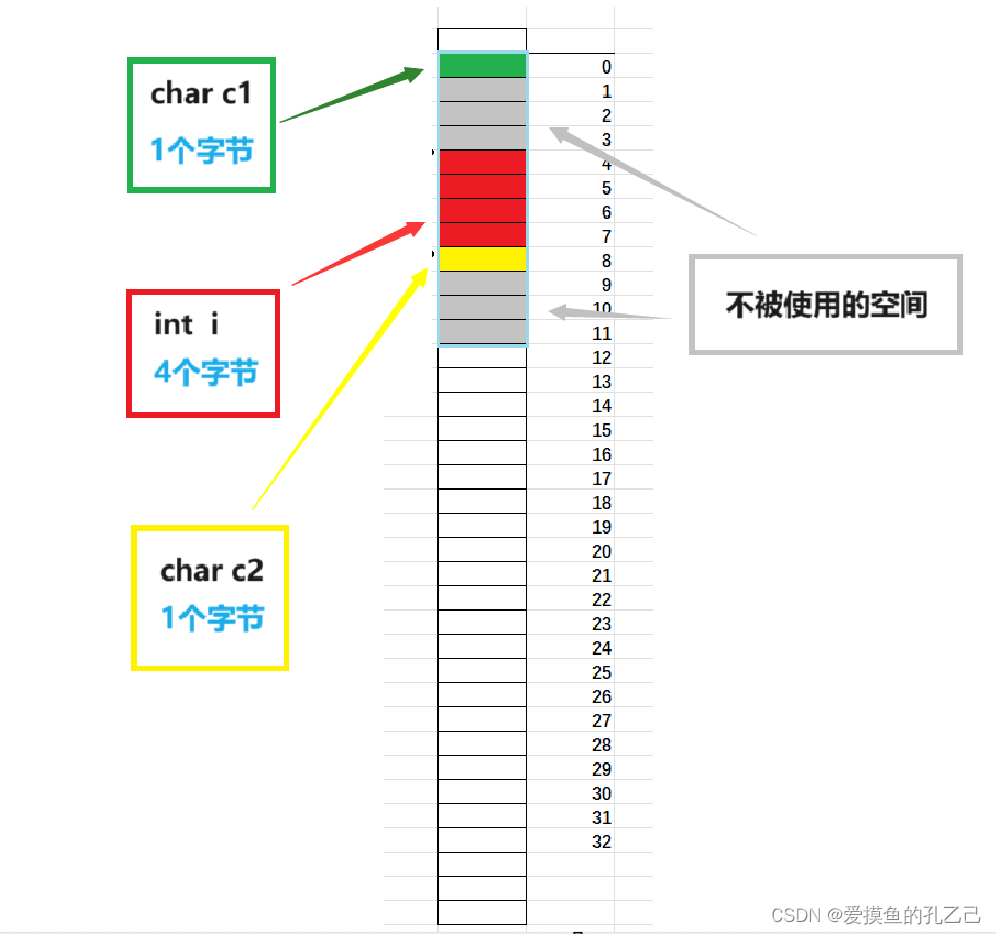 首先,结构体的第一个成员对齐到结构体变量起始位置偏移量为0的地址,所以我们将char (绿色区块)放在起始位置偏移量为0的地址。对于int i (占用4个字节)要对齐到对齐数的整数倍(VS中默认对齐数是8,int是4,因此对齐数取4)的地址处,也就是偏移量为4的地址处,因此前3个字节将会被浪费。紧接着char c2(黄色区块)默认对齐数是1,又根据“ 结构体总大小为最大对齐数 (结构体中每个成员变量都有⼀个对齐数,所有对齐数中最⼤的)的整数倍”,也就是4的整数倍(12),因此也会损耗3个字节空间。