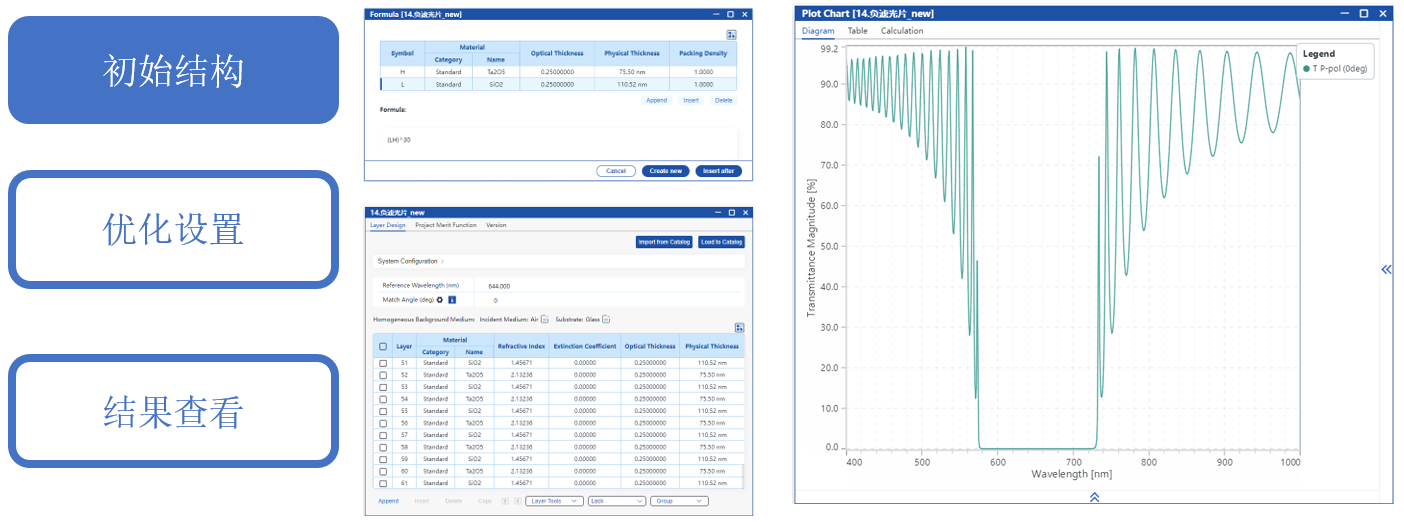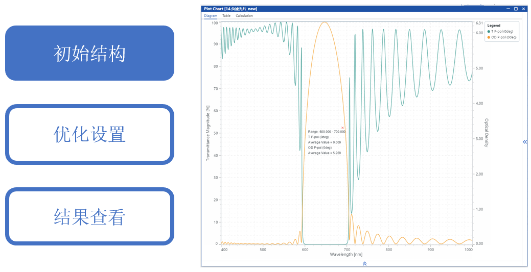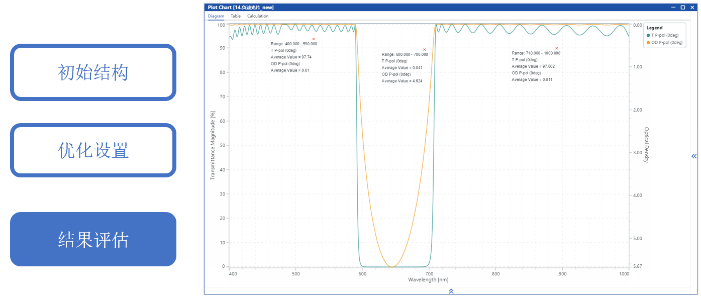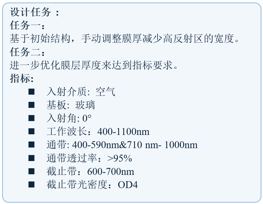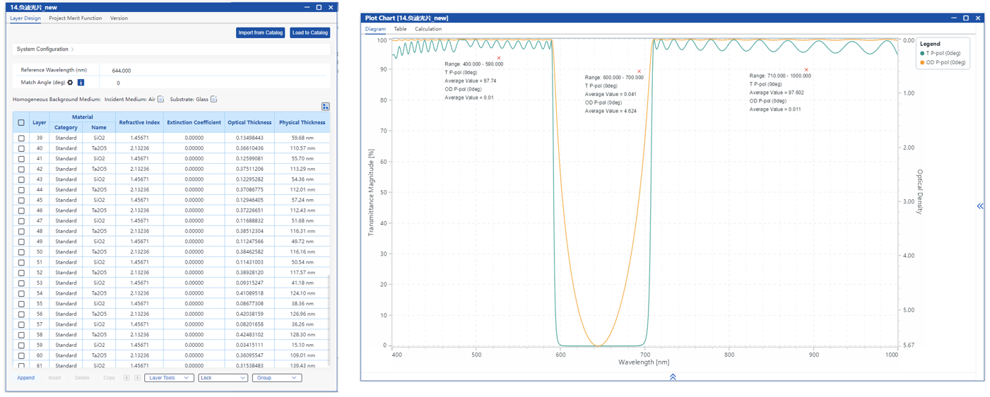 通过手动调整初始结构并优化层厚度,目标是在0°入射时,600-700 nm截止,平均光密度>4。400-590 nm和710-1000 nm透过,平均透射率>95%。