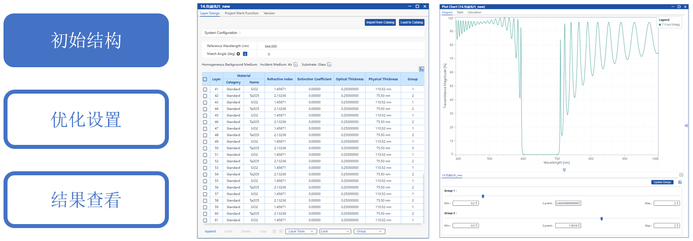 通过逐渐减小四分之一堆栈中低折射率层的厚度、同时相应增加高折射率层的厚度,可以有效减小高反射区的宽度。在软件中,将所有低折射率膜层被设定为一组,高折射率膜层设定为另一组。用户可在光谱图中通过调整这两组的厚度系数,实现低折射率膜层整体减小、高折射率膜层整体增大,从而使截止带的位置和宽度更接近目标指标。