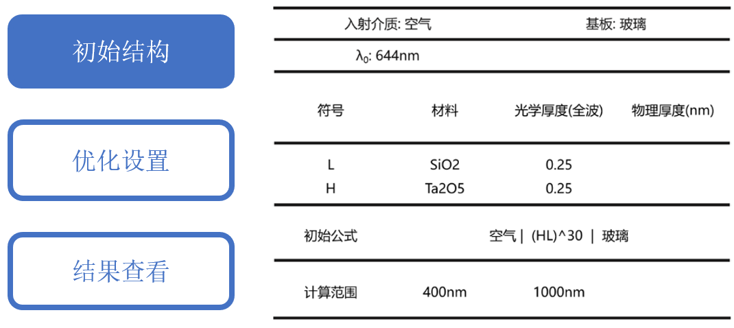 使用公式工具构建了上述膜系作为基础结构,右图展示了其在400-1000 nm内0°入射时的光谱。可以看出此时在的高反射区间相比指标较宽且透射波段有很多的波纹。