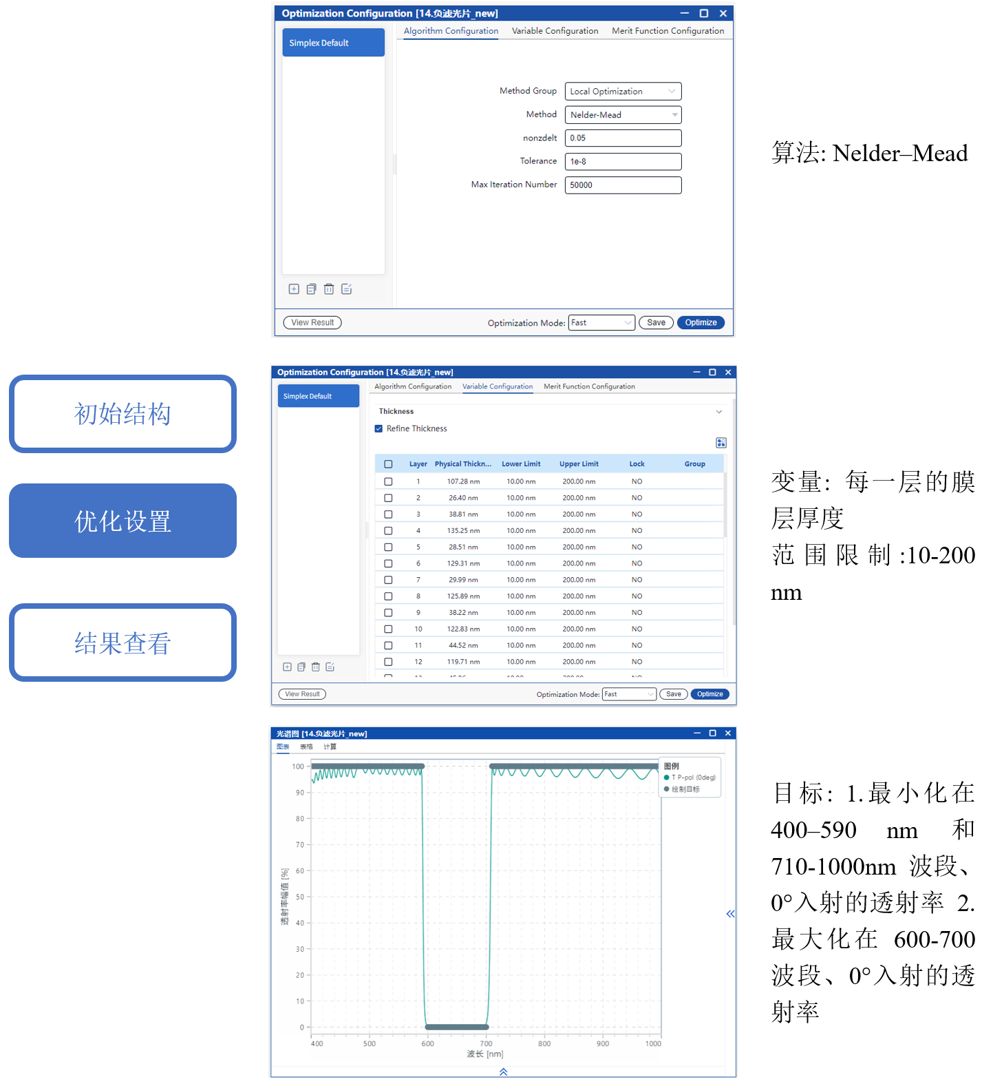 采用 Nelder-Mead 算法对各层厚度进行优化,目标是最大化通带透射率同事最小化截止带透射率。