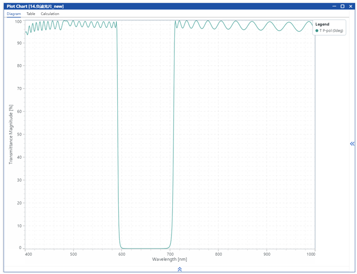 在本应用案例中,选用了常规的1/4波长堆栈作为初始结构。首先通过手动调整低折射率层和高折射率层的厚度,获得截止位置和带宽均符合要求的高反射区;随后进一步优化膜层厚度,设计出一种负滤光片,其截止范围为600–700 nm,通带覆盖400–590 nm和710–1000 nm。