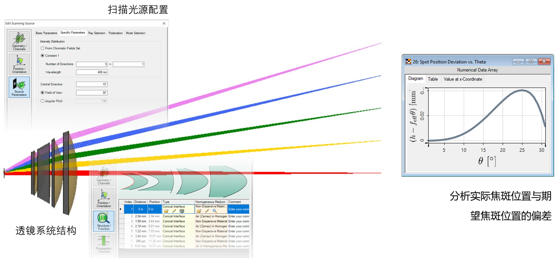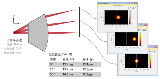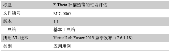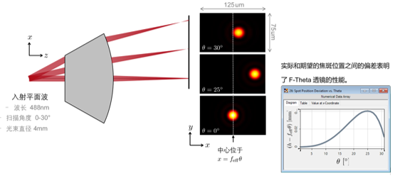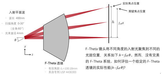 在激光扫描系统中,F-Theta镜头通常被设计用于提供高性能。使用此类透镜,在目标平面上的聚焦点位移与焦距和扫描角度的产生成正比。这使得它们成为基于Galvo扫描器的激光材料处理系统的标准镜头。在VirtualLab Fusion中扫描源的帮助下,通过测量实际光斑位置与期望值之间的偏差和不同角度下光斑的大小,分析了给定F-Theta透镜的性能。