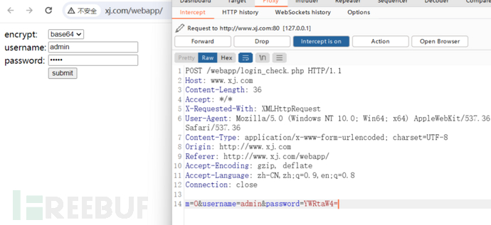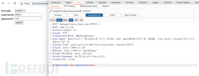 其实口令admin、admin是正确的,只不过我们提交password已经是明文的admin了,后面还会对这个admin进行解密,导致解密后的口令就不再正确了,所以我们还需要在Burpsuite把数据提交给服务端服务器之前,重新把数据给加密回来。