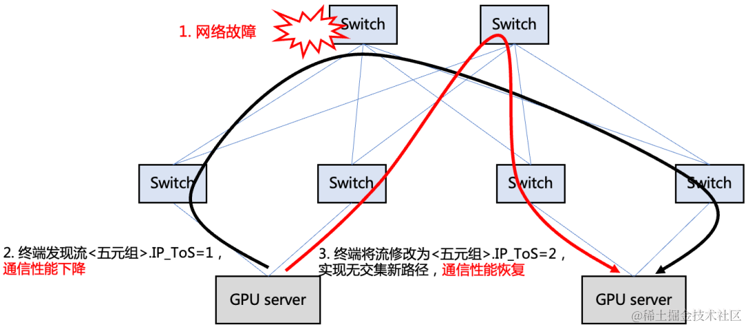 一些网络故障(例如静默丢包)的发生是不可被预期的,在网络故障演练时发现,一些网络故障(例如静默丢包)发生后通信库就会出现超时,导致训练业务进程长时间卡死,虽然可以依靠拉起定期的保存的 checkpoint,但是也需要回退版本,损失精度,且整个过程需要几十分钟来加载和推送参数等。此前我们通过网络上的各种探测手段,或是基于探针,或是基于设备状态,加上控制器路由隔离手段,将故障自愈时间控制在 20s 以内。然而在面对高性能业务的秒级自愈要求下,我们转变了避障思路,需求起源于业务,那么为何不把避障的主动权交于业务呢?为了让极致性能恒久,我们推出了秒级故障自愈产品——“HASH DODGING”。