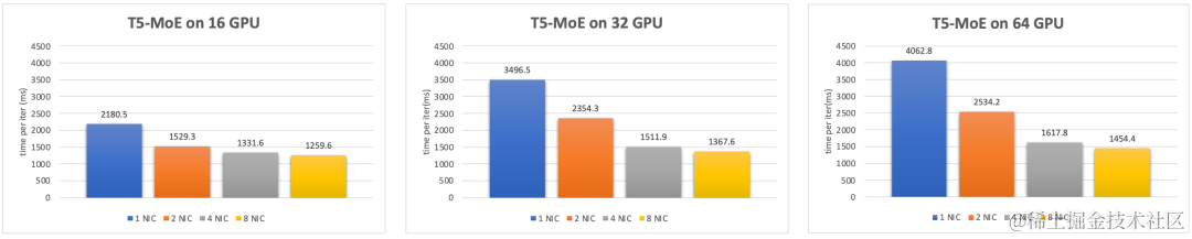 上图是对 T5-MoE 模型的实测性能数据,主要通信模式是 All-to-All。同样可以看到,在 64 GPU 模型下,1.6Tbps 带宽下的单次迭代训练耗时降低 64%。从集群算力的角度,相当于用同样的计算资源,超带宽网络能将系统算力提升 2.8 倍。