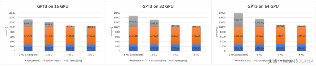 上图是对 GPT3 模型的实测性能数据,主要通信模式是 AllReduce。以 64 GPU 规模为例,由于 1.6Tbps 超带宽网络将 AllReduce 的耗时大幅缩短 14 倍,将通信占比从 35% 减少到 3.7%,最终使得单次迭代的训练耗时减少 32%。从集群算力的角度,相当于用同样的计算资源,超带宽网络能将系统算力提升 48%。