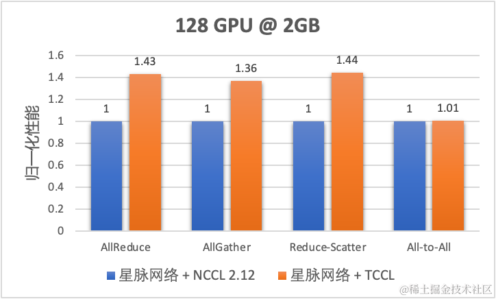 腾讯高性能集合通信库 TCCL(Tencent Collective Communication Library)定制适配星脉网络硬件平台,在 AllReduce/AllGather/ReduceScatter 等常用通信模式下带来 40% 的性能加速。