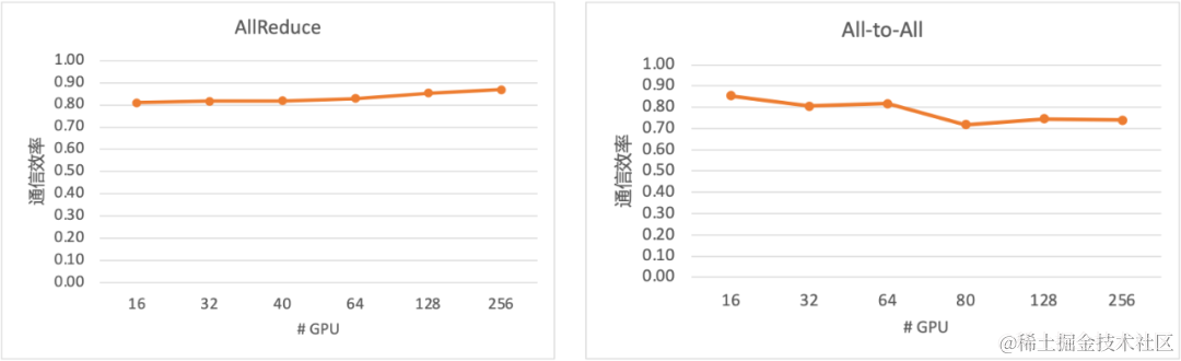 从上图实测的集合通信性能可以看出,在不同网络规模下,AllReduce 与 All-to-All 始终能维持较高的集合通信效率。