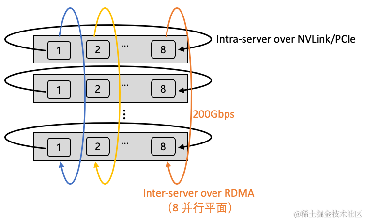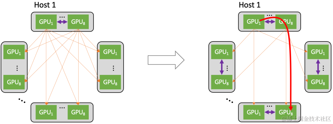 上图展示了 All-to-All 集合通信如何利用异构网络来优化。当机间、机内网络同时使能时(右图):不同 host 上相同位置的 GPU 仍然走机间网络通信;但是要去往不同位置的 GPU(比如 host1 上的 GPU1 需要向其他 host 上的 GPU8 发送数据),则先通过机内网络转发到对应位置的 GPU 代理上,然后通过该 GPU 代理走机间网络来完成通信。
