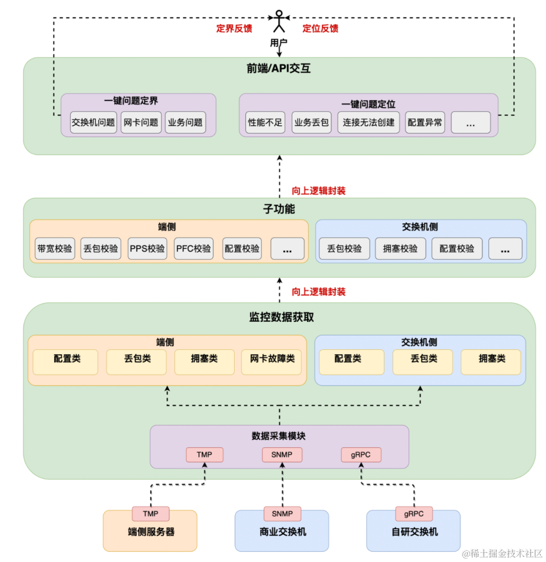 整体系统具备层次化多维度的特征,通过端侧服务器以及交换机上的各种计数,向上逻辑封装抽象为子功能,例如带宽校验 & 丢包校验等。之后继续向上逻辑封装,形成定位与定界的场景,底层复杂的技术与逻辑彻底透明化,自下而上,最终呈现到用户的只有简单易用的场景按钮。目前高性能网络运营平台已支持“性能不足”、“业务丢包”、“配置异常”、“连接建立不成功”四个维度的一键故障定位,优雅地为高性能网络业务提供一键自检,健康可视等功能。