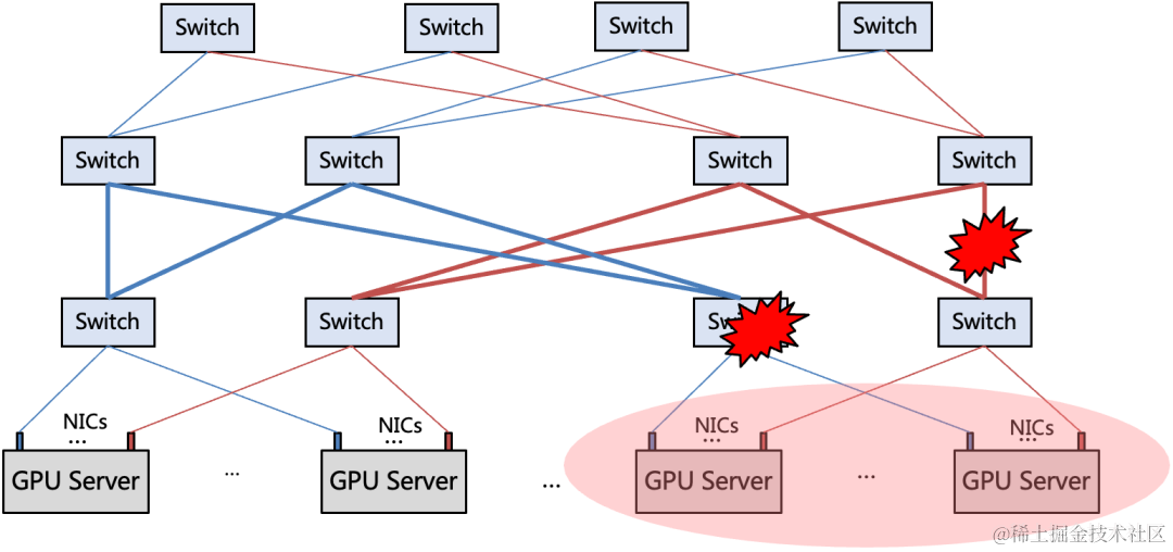 GPU 集群规模达到一定量级后,如何保障集群系统的稳定性,是除了性能外必须面对的另一个挑战。网络的可用性,决定了整个集群的计算稳定性,这是由于: