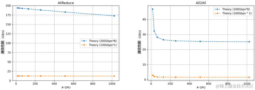上图从理论上展示了 1.6Tbps 带宽与 100Gbps 带宽的集合通信性能对比。可以看到,对于 AllReduce 和 All-to-All 这两种典型通信模式,在不同集群规模下,1.6Tbps 超带宽都会带来 10 倍以上的通信性能提升。