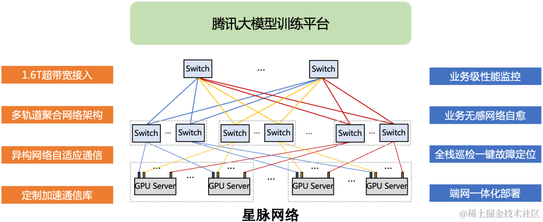面对千亿、万亿参数规模的大模型训练,仅仅是单次计算迭代内梯度同步需要的通信量就达到了百 GB 量级,此外还有各种并行模式、加速框架引入的通信需求,使得传统低速网络的带宽远远无法支撑 GPU 集群的高效计算。因此要充分发挥 GPU 计算资源的强大算力,必须构建一个全新的高性能网络底座,用高速网络的大带宽来助推整个集群计算的高效率。面向 AI 大模型训练需求,腾讯推出了业界领先的高性能计算网络架构——星脉:采用 1.6T 超带宽接入、多轨道聚合流量网络架构、异构网络自适应通信、定制加速通信库,构建了 1.6T ETH RDMA 高性能网络。