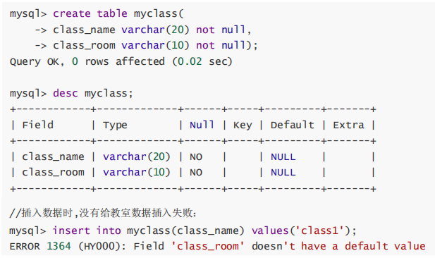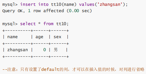 默认值的生效:数据在插入的时候不给该字段赋值,就使用默认值