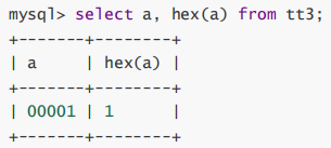 这次可以看到a的值由原来的1变成00001,这就是zerofill属性的作用,如果宽度小于设定的宽度(这里设置的是5),自动填充0。要注意的是,这只是最后显示的结果,在MySQL中实际存储的还是1。为什么是这样呢?我们可以用hex函数来证明。