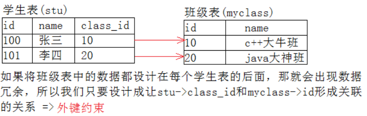 理论上,上面的例子,我们不创建外键约束,就正常建立学生表,以及班级表,该有的字段我们都有。