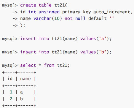 auto_increment:当对应的字段,不给值,会自动的被系统触发,系统会从当前字段中已经有的最大值+1操作,得到一个新的不同的值。通常和主键搭配使用,作为逻辑主键。