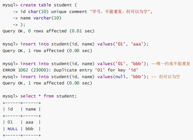 唯一键的本质和主键差不多,唯一键允许为空,而且可以多个为空,空字段不做唯一性比较。 关于唯一键和主键的区别: