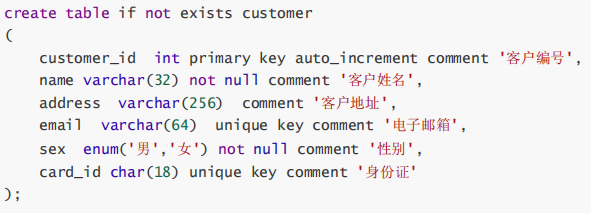 b、客户customer(客户号customer_id,姓名name,住址address,邮箱email,性别sex,身份证card_id)